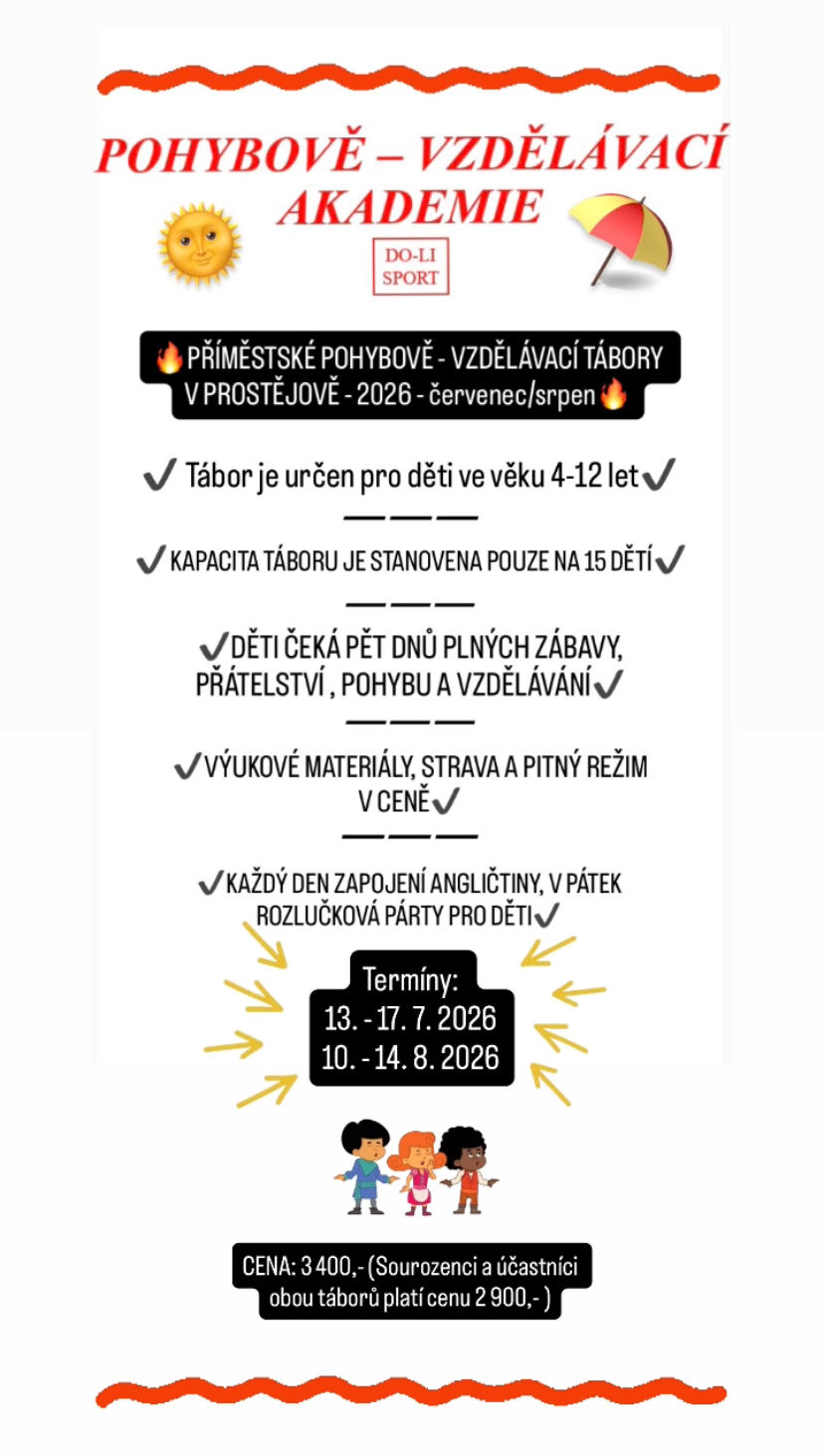 POHYBOVĚ - VZDĚLÁVACÍ TÁBORY 2026 V PROSTĚJOVĚ JSOU V NABÍDCE! Každý den zábava, pohyb, anglický jazyk a vzdělávací hry. Vše (jídlo, pití, vzdělávací materiály a další předměty) je v ceně, neplatíte nic navíc. Naším cílem je spokojenost rodičů, dětí, tím pádem i naše:).